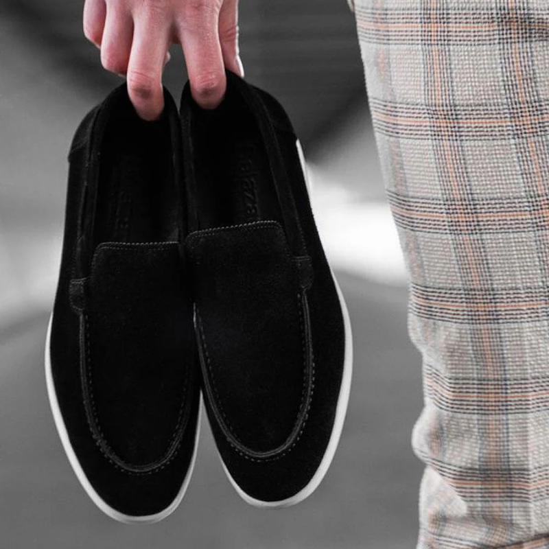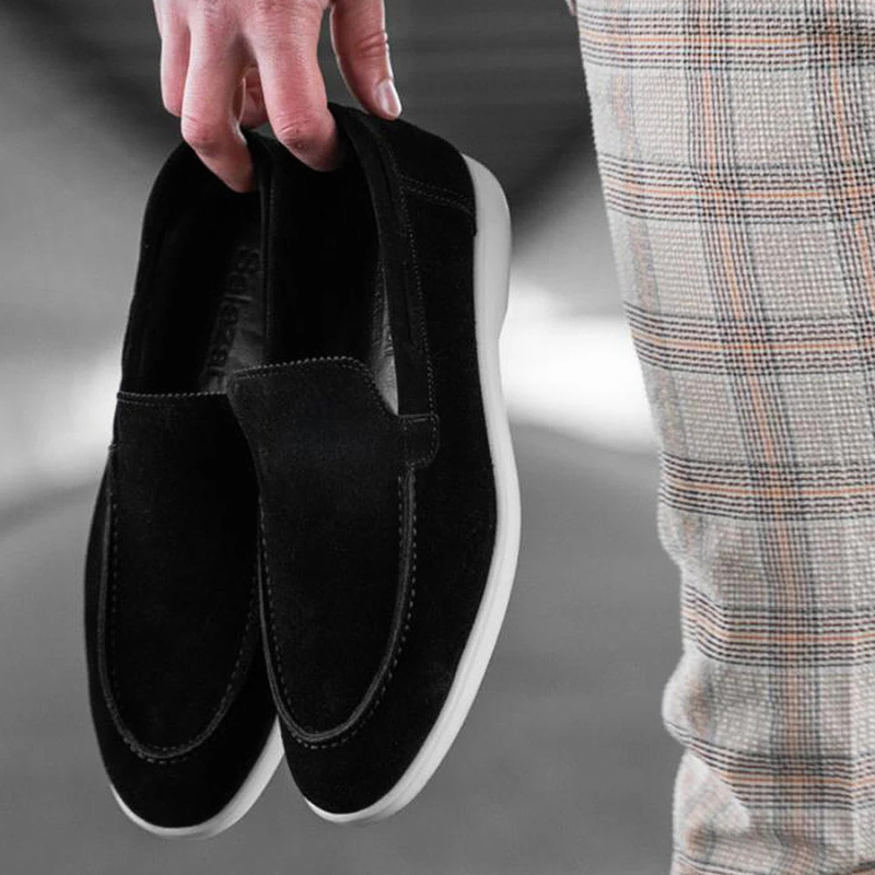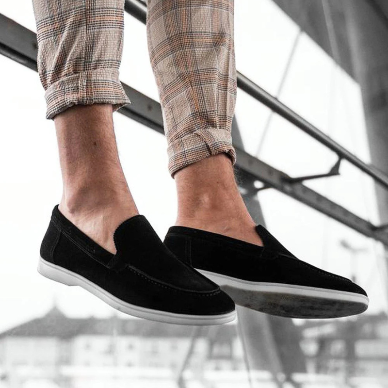 Mocasines negros de cuero ante con diseño moderno y elegante, ideales para el trabajo y ocasiones especiales. Su suela blanca de goma ofrece máxima comodidad y estabilidad durante todo el día. Material de alta calidad, ligero y resistente, perfecto para hombres que buscan estilo y confort en cada paso.